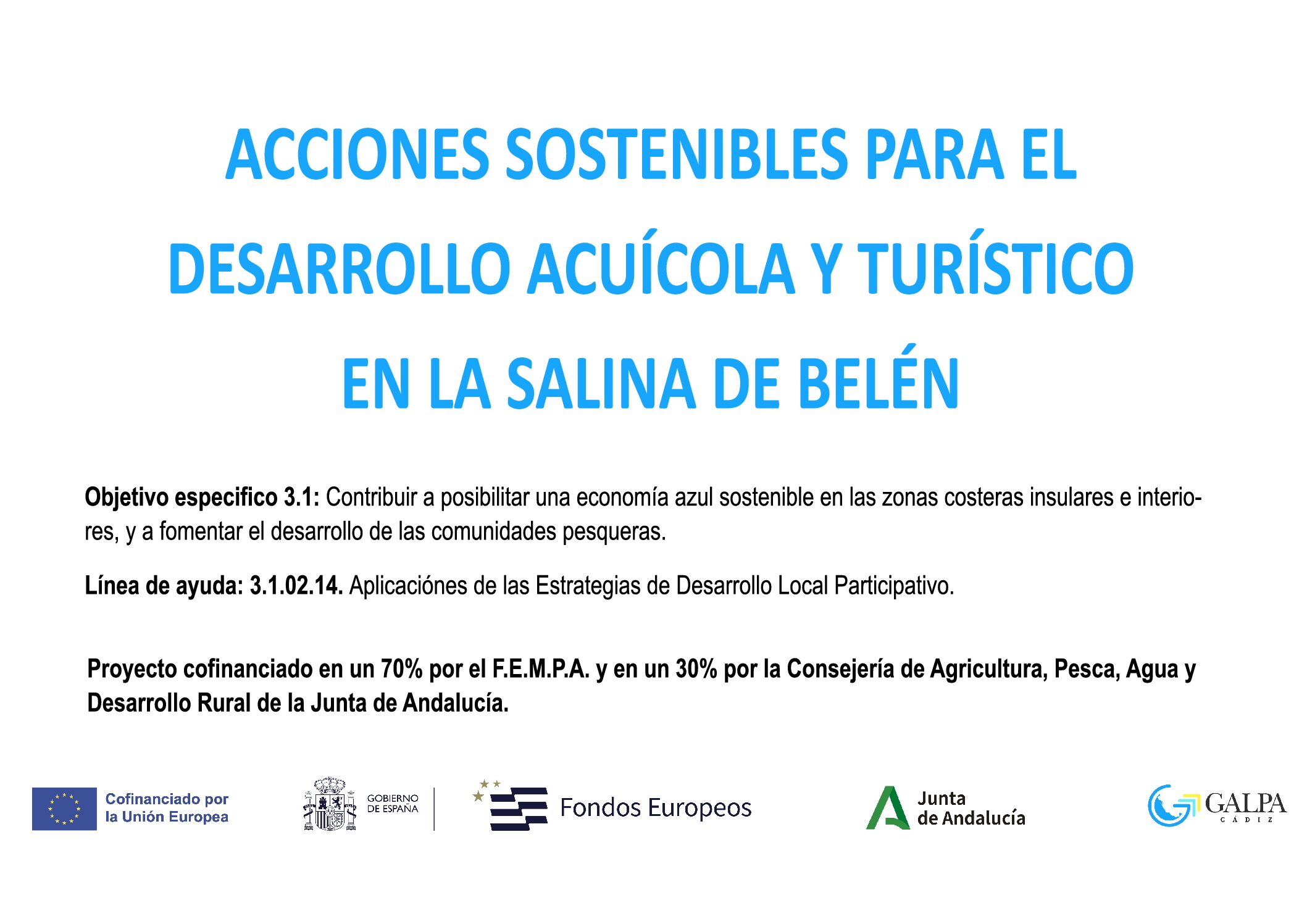 En la Salina de Belén, estamos comprometidos con el futuro. Este proyecto, cofinanciado por la Unión Europea y la Junta de Andalucía, impulsa el desarrollo acuícola y turístico sostenible, contribuyendo a una economía azul y fortaleciendo nuestra comunidad pesquera local.